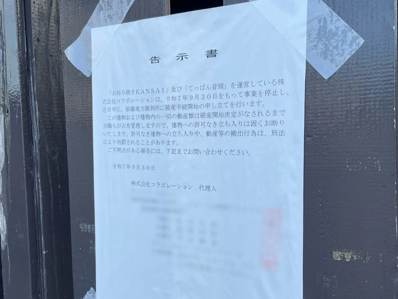 【高崎市】あの鉄板焼き専門店に、突然のニュース。2025年9月30日、「お好み焼き KANSAI」等の店舗を運営していた「株式会社コラボレーション」が事業を停止しました。