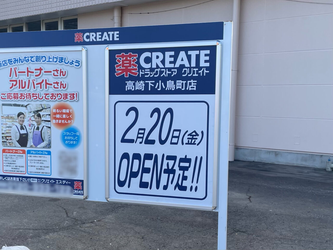 お店の名前は、「クリエイト エス・ディー 高崎下小鳥町店」。店舗の敷地内に設置された告知によりますと、2026年2月20日にオープンが予定されています!