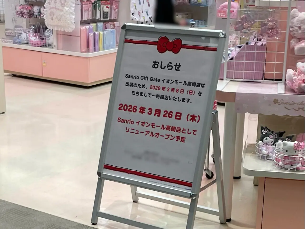 「イオンモール高崎」のWEBサイトによりますと、2026年3月8日をもって一時閉店となるそうです。なお、3月26日に「Sanrio イオンモール高崎店」としてリニューアルオープンが予定されています。
