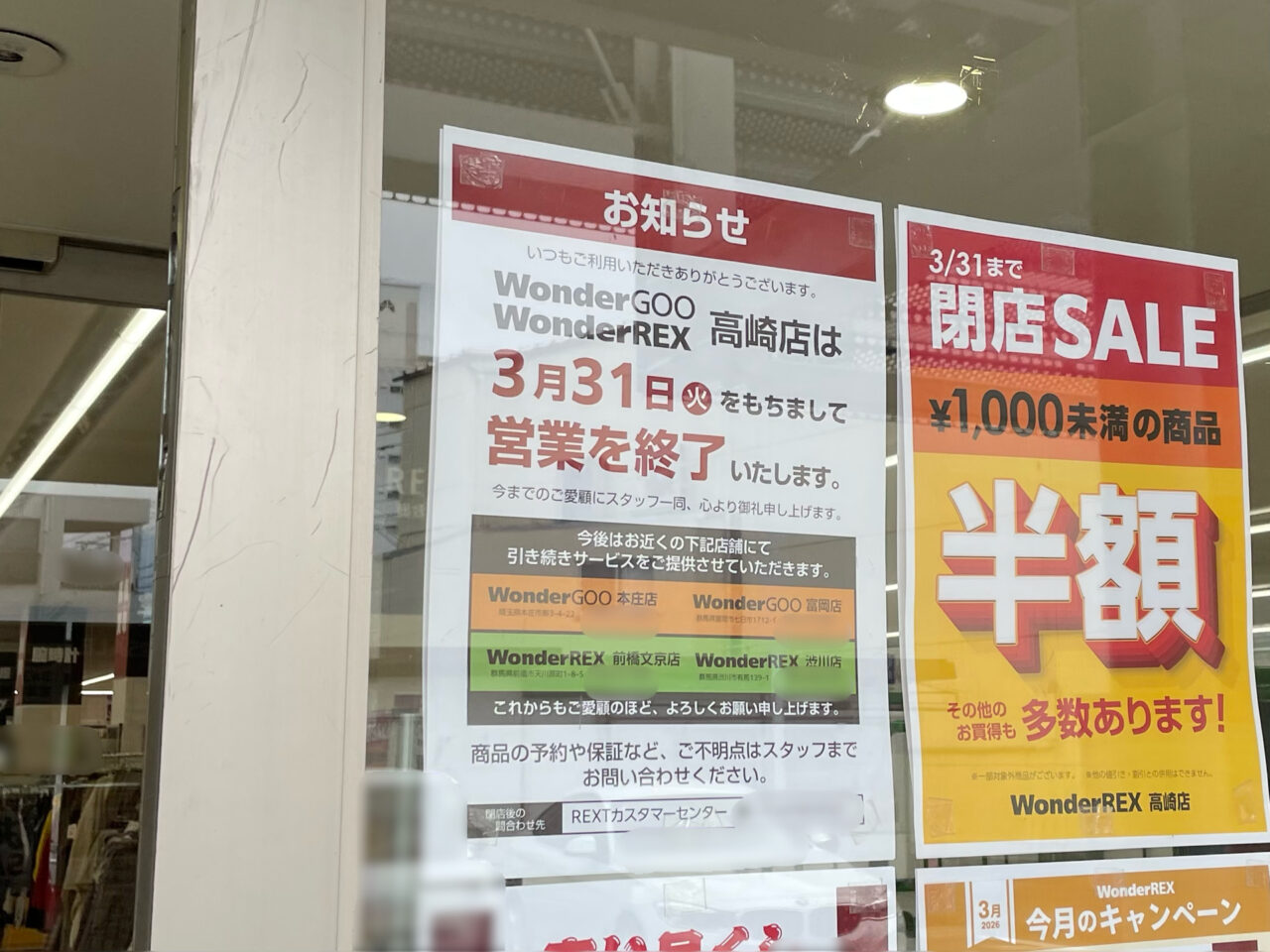 【高崎市】貝沢町のあの2店舗が年度末に閉店。2026年3月31日、「WonderGoo高崎店」と「WonderREX高崎店」が営業を終了するそうです。