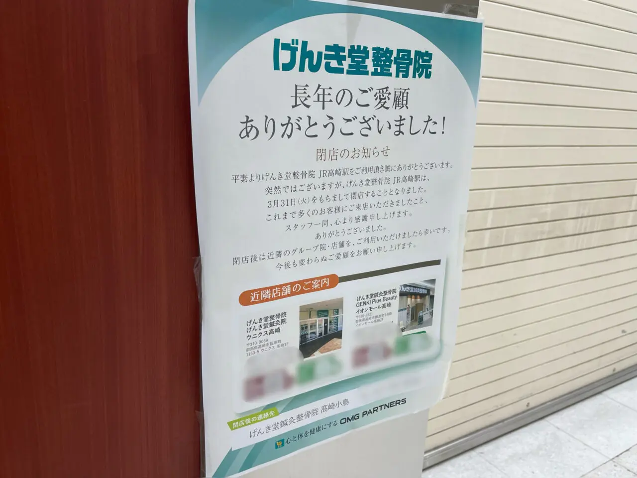 【高崎市】JR高崎駅構内にあった整骨院でしたが…。2026年3月31日に「げんき堂整骨院/げんき堂整体院」が閉店しました。