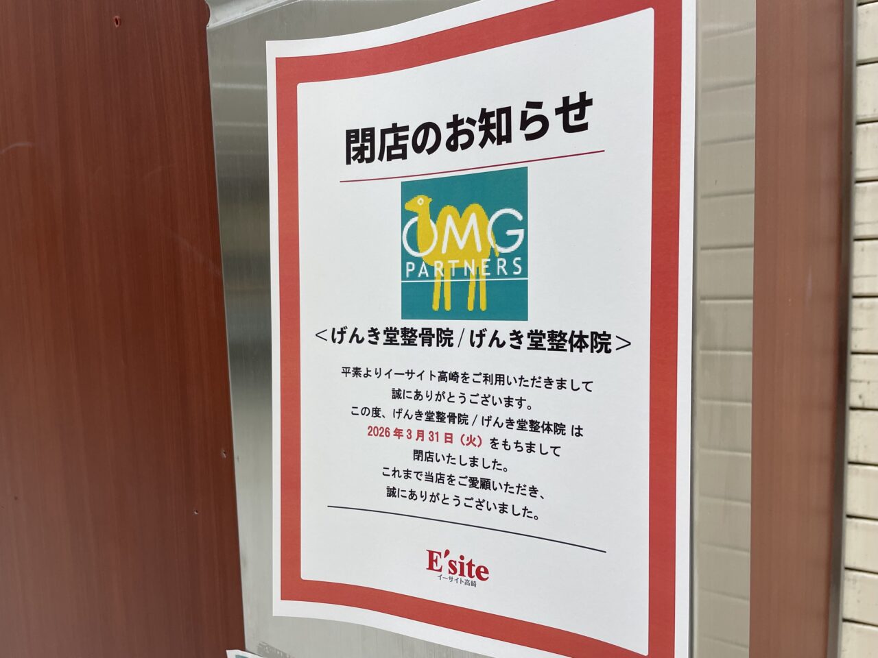 JR高崎駅構内のイーサイトにあった「げんき堂整骨院/げんき堂整体院」が閉店したことが分かりました。