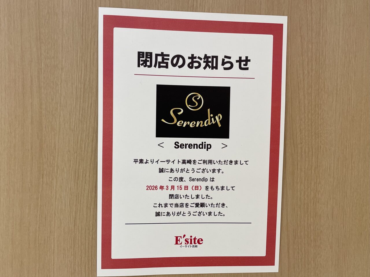 JR高崎駅構内の「イーサイト高崎」内にあった、プリンとフィナンシェのお店「Serendip」が閉店したことが分かりました。